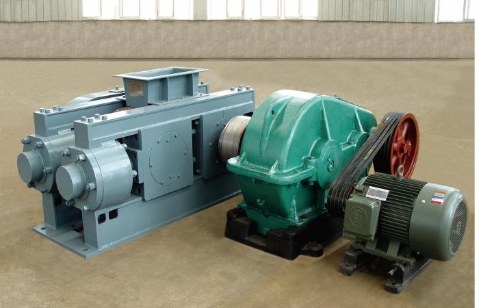 壓制難以成型的粉狀物料,其特點是成型壓力大、主機轉(zhuǎn)數(shù)可調(diào)、配有螺旋送料裝置。經(jīng)皮帶,傳至減速器,減速器通過聯(lián)軸器,傳至主動軸再由一對開式齒輪,保證兩滾軸同步(等速反向)物料儲料倉經(jīng)定量設(shè)備均勻地進入成型料斗,使物料的單位成型壓力由小變大,在對輥中心連線處成型壓力達到最大值,物料過該線后,成型壓力迅速變小使物料進入脫球狀態(tài),順利脫球。